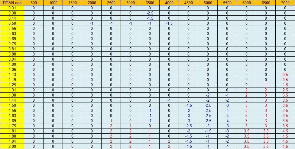 It would appear that you definitely have ~5° more timing advance than I do in the 4500-5500RPM range. After I install my FMIC and digest the changes that it requires in my tune, I will probably make my next map adding 1° in those ranges and monitoring for awhile. |