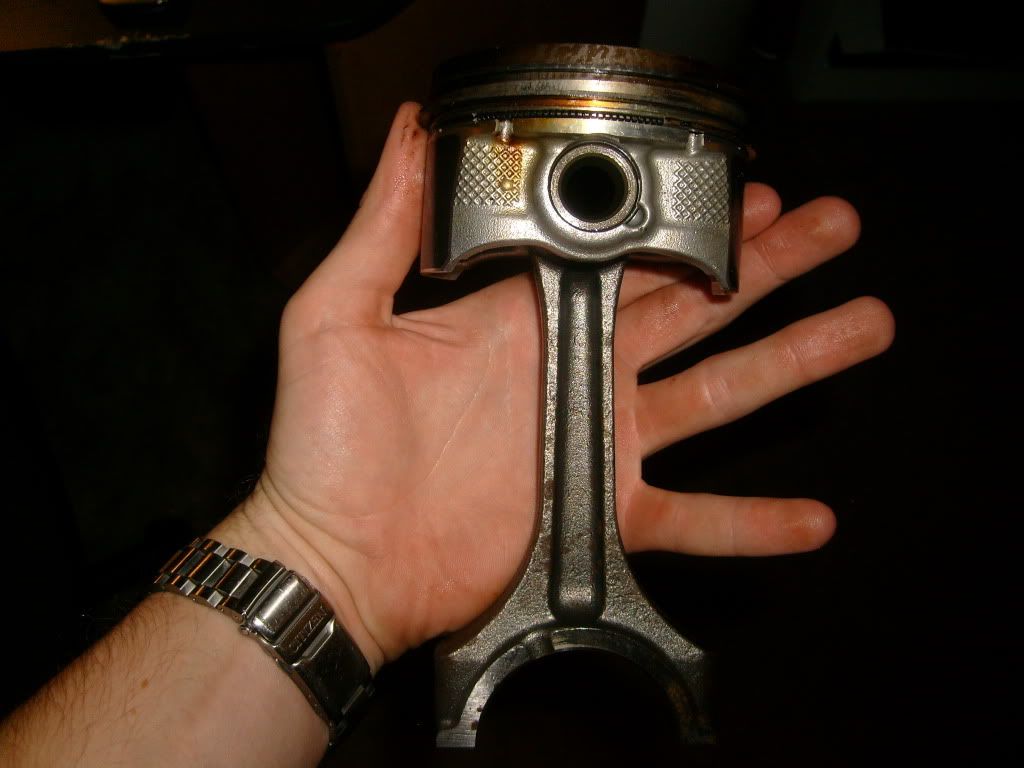 (Thread Starter) | Not Ranked : 0 score PTP...just leave my thread alone. You can make a thread saying "AFCADET IS A LIAR!" if you want...just don't shit on my thread. We have our theories and we can let other people judge themselves if they are real or not. But don't come in here combating our theories by just trying to second guess us and tell us, "WELL I HAVE DATA!". Like another person has mentioned...the only test I have ever seen done on the freeze plug is the video of you spraying through a open manifold. Thats it. If you have real data...then post it in your "AFCADET IS A LIAR" thread. Untill then, go home and let others judge this information how they see fit. I have nothing against your company and actually have purchased multiple products from you (Windage tray, BS Detele, and methanol) so I obviously supported you. So why in the hell would myself and others make shit up about PTP??? Its because we didn't make it up...and the evidence we found points to the freeze plug nozzle as a possible culprit. And p.s. If you would please post a link to the thread of others leaning out on meth...Id appreciate it. I think your are completely full of shit saying others have too, because I spent a good month searching around looking for answers to our car and what is the best AFR to run with meth, and I found nothing. I made my own thread titled "making power with meth" and it was specifically about leaning it out, and no one chimed in saying they leaned farther then high 11s. It was a multiple page thread and was up for a while...so Im sure if someone with expereince that had leaned out with meth was around...they would have chimed in there. Heres the last piston/rod. I know for a fact this came out of cylinder 2 because it was the first one to pop out and everyone was like...holy shit that piston is clean for having 40,000 miles. ![]() ![]() ![]()