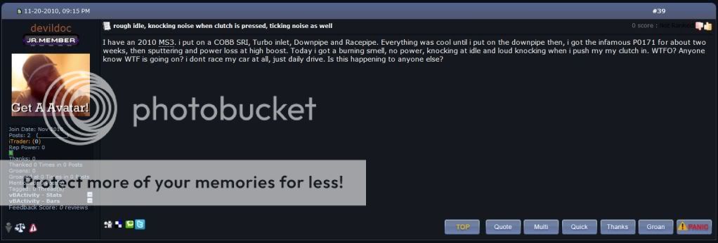 I have an 2010 MS3. i put on a COBB SRI, Turbo inlet, Downpipe and Racepipe. Everything was cool until i put on the downpipe then, i got the infamous P0171 for about two weeks, then sputtering and power loss at high boost. Today i got a burning smell, no power, knocking at idle and loud knocking when i push my my clutch in. WTFO? Anyone know WTF is going on? i dont race my car at all, just daily drive. Is this happening to anyone else? Doesn't sound too stock to me. And I haven't run across cels yet (don't have that many mods), but I think I would do something if I got an "infamous p0171"... Assuming that is bad. Quote: