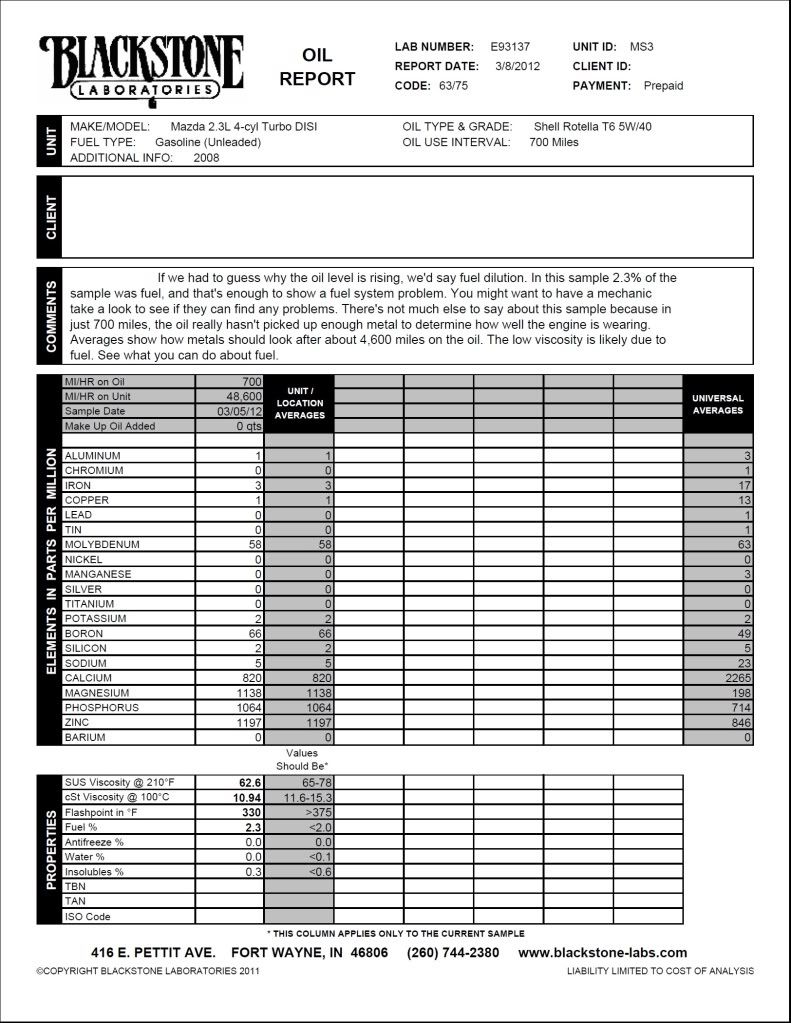 Here is the result from my first run with Rotella T5 10W-30. I used this oil through out the winter in Maryland and took a sample to make sure there weren’t any bad effects from using a thicker start up oil. I will probably go a little longer before I change it out. Mazdaspeed6 MI/HR on Oil = 1700 MI/HR on Unit = 27088 Oil Change Date = 12/22/2010 Sample Date = 04/06/2011 Make Up Oil Added = 0 ALUMINUM = 2 CHROMIUM = 0 IRON = 4 COPPER = 12 LEAD = 1 TIN = 0 MOLYBDENUM = 1 NICKEL = 0 MANGANESE = 0 SILVER = 0 TITANIUM = 0 POTASSIUM = 3 BORON = 14 SILICON = 5 SODIUM = 53 CALCIUM = 2135 MAGNESIUM = 8 PHOSPHORUS = 901 ZINC = 1032 BARIUM = 0 SUS Viscosity @ 210°F = 57.9 (59-65) cSt Viscosity @ 100°C = 9.61 (9.9-11.9) Flashpoint in °F = 385 Fuel % = <0.5 Antifreeze % = 0.0 Water % = 0.0 Insolubles % = 0.4 |
