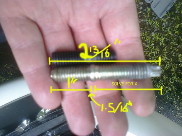 Show me where to buy a stud like the one above, that's about 1/4" shorter and still has a hex head on it, and I'm all over it. I called this local bolt specialty place that referred me to a metric bolt specialty place in MD, and they were like 'no way.' I even tried McMaster's and came up short. perhaps finding one of a different car that happens to be shorter? IDK.. I'm not looking that hard. If you see something soon let me know! |