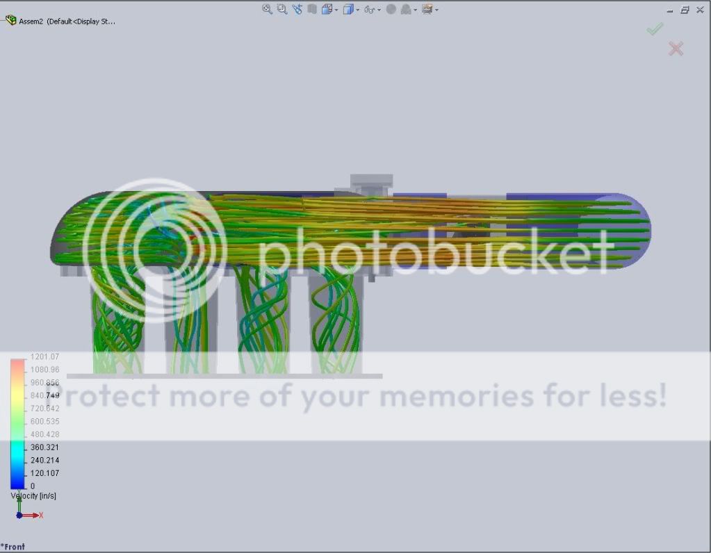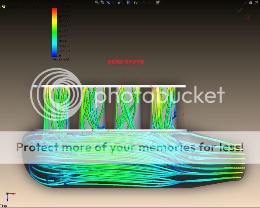 Ok here are the new projected flow paths. original http://i608.photobucket.com/albums/t...ress_snap1.jpg raised lip http://i608.photobucket.com/albums/t...elocitylip.jpg Flush lip http://i608.photobucket.com/albums/t...elocitylip.jpg The velocity on the flush lip slows down in runners #1 and #3 giving dead spots. Also the flush design starves runners #2 and #3. I may have not understood what you were saying. Is this what you meant by "flush", or did you mean just a square edge? http://i608.photobucket.com/albums/t...kemanifold.jpg Better yet http://i608.photobucket.com/albums/t...emanifold2.jpg http://i608.photobucket.com/albums/t...ss_snap1-1.jpg |