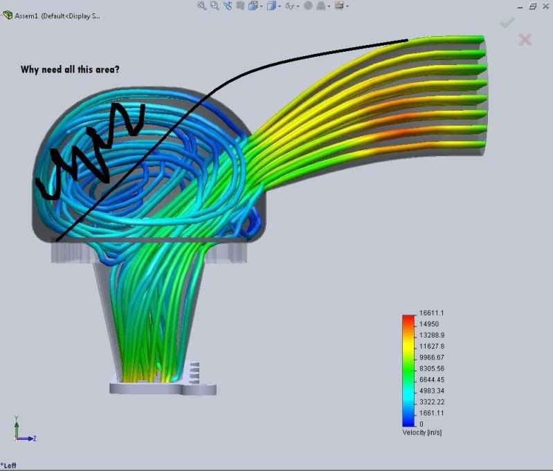 Ok, maybe I'm just out there. But what if you took some of the bulging off the sides and front of the manifold? (Do you see what I'm saying?..on the bulging away from the airflow)..none of that is really being used but is still going to be filled up with excess air. I would think if you kinda shaved off those bulges and it would be more of a direct flow. I think that would help some of your velocity through the stacks. I dunno but here is a shitty paint drawing for what I'm talking about. If I don't know shit and that is completely wrong then just say so.. I'm just throwing this out there. http://i223.photobucket.com/albums/d...anirevised.jpg |