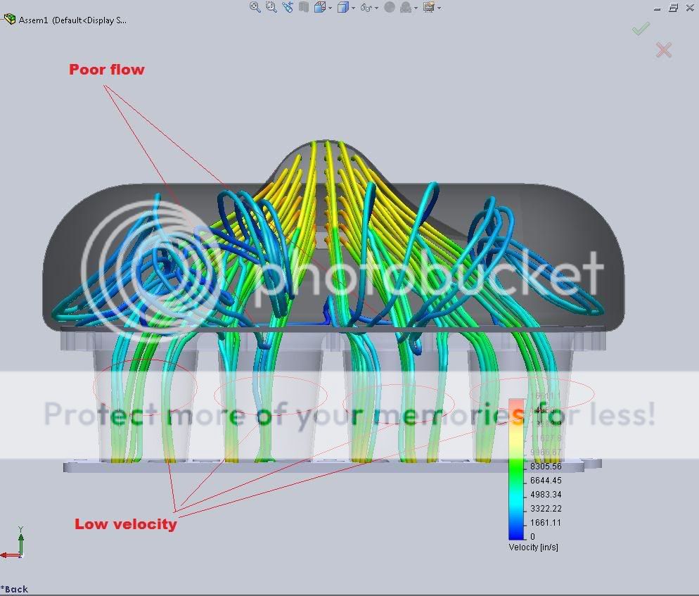 If the cost, time ect. is too much then I'll just release the drawings the the community. That way you can submit the drawings to a shop, get the parts made, and build it yourself. Kind of a DIY kit manifold. More playing around. So far the MZR-R design has yielded the best flow characteristics so far (Big suprise) http://i608.photobucket.com/albums/t...ss_snap1-2.jpg http://i608.photobucket.com/albums/t...ss_snap2-1.jpg I have played around with the diffuser height and angle, and while I can get a more direct flow to the Velocity Stacks, the flow in the Velocity Stacks is not as nice. http://i608.photobucket.com/albums/t...ess_snap22.jpg http://i608.photobucket.com/albums/t...ess_snap12.jpg http://i608.photobucket.com/albums/t...ss_snap3-2.jpg At this point I'm going to stick with the MZR-R design and tweek it a bit. David Edit: First post updated . |