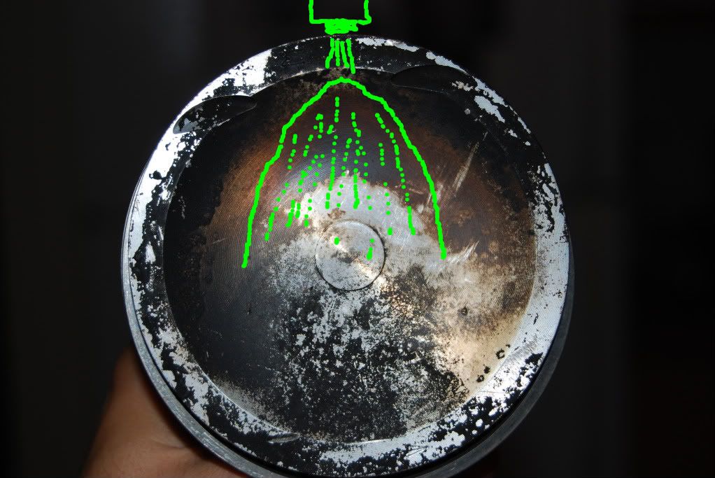 1 Attachment(s) I really wish this wouldn't turn into a bitching fest. I apologize to those I offended, I didn't mean to upset you. I simply showed the fact that the oil control rings have failed on a working motor. I have also shown that our fuel injection system impinges fuel on the cylinder wall and cools the piston unevenly. None of these are issues seen on a regular port injection engine or well designed diesel. These are all possible sources of failure. There are many others and you all know these motors knock and are temperamental in ways PI engines we're used to are not. On the one hand I read complaints asking why does this motor blow etc etc. I am pointing out flaws I and others have seen and that I am sure all of you can agree are there. Does it take out 100% of motors? Probably not. Does it add to the potential of motor failure? Probably yes. I too am disappointed by some of the inadequacies of this first gen DI system and I too bought the brand new car (for 37k including taxes none the less here in Canada) so I have every right to be butt hurt about it but I try to find things out instead of digging my head in the sand. So please don't be offended and let's keep this on track. Attached is an image showing the fuel pattern as it is sprayed on the piston crown. |