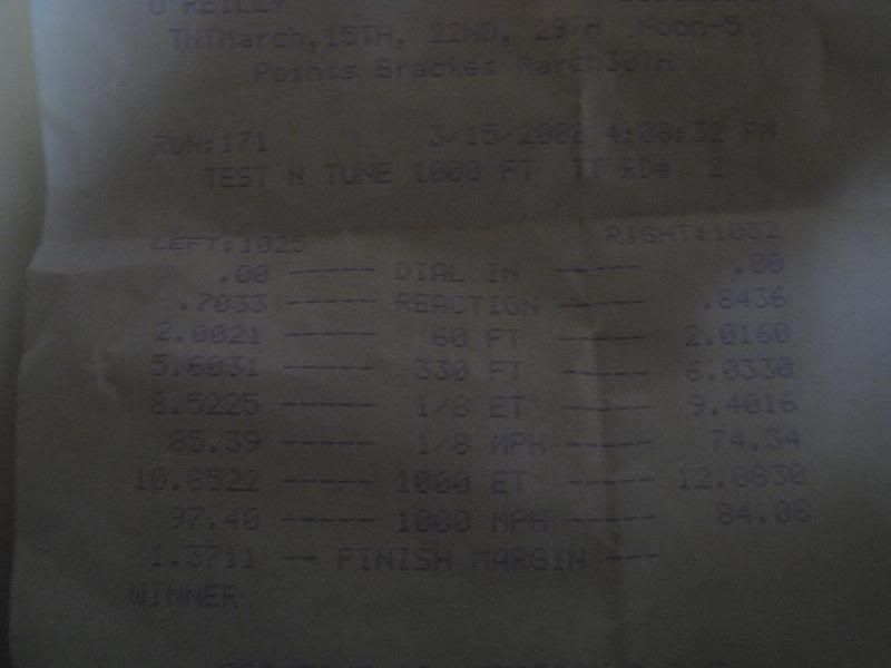 my 1/8th was a 8.4 @ 87.7 and your is 8.5 @ 85.3 and yet your are actually faster than me at 1000. I went 10.858 on my 12.90....wierd. Thats a killer time for your mods if the track is legit Somhow u were a tenth off at the 1/8th and 2 mph slower but managed to edge me to the 1000? lol makes no sense to me. |