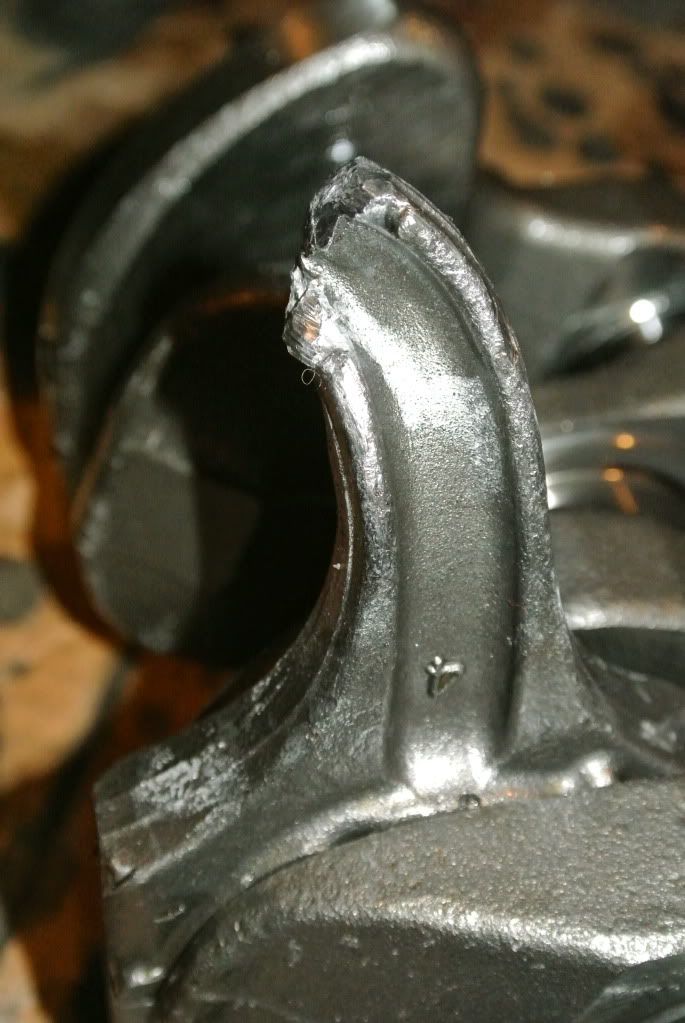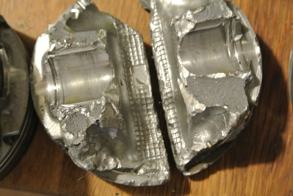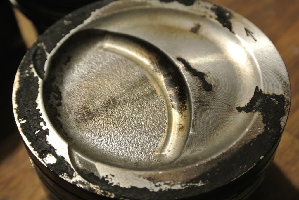 | Not Ranked : 0 score I would say the piston just looks like it got fucked by the rod. Plenty of impact marks on the bottom and at one point after the rod had snapped it looks like it beat the piston till it broke in half...most likely after it beat the wrist pin out, leaving the piston to float about even rotating and getting beat some more by the rod on top. Nothing sticks out as unusual...except for the fact it's broken.