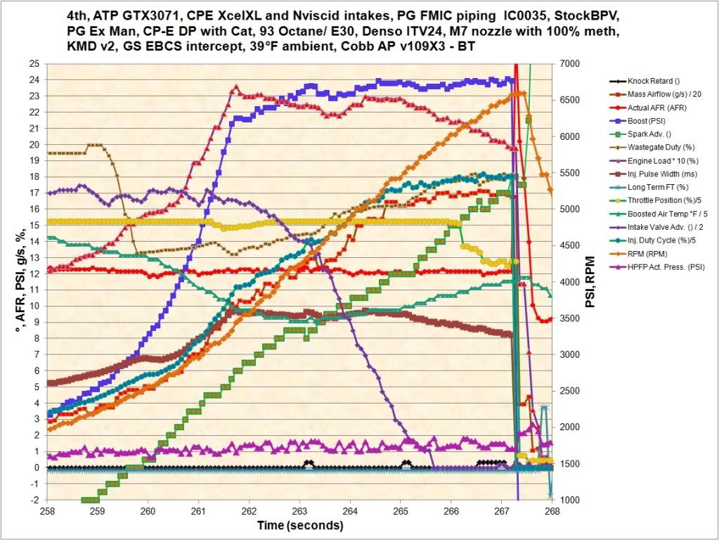 My initial results do not indicate that the fuel scaling helps shift us under LCV2™: http://i77.photobucket.com/albums/j6...30112-1log.jpg I should have been tapering up to 25 PSI by 6500 RPMs where I was targeting 2.05 load, but the throttle started to close and the WGDC didn't go up to support this. So instead I was at 24 PSI and 1.99 load at 6500 RPMs. Still making decent power though: http://i77.photobucket.com/albums/j6...030112-1vd.jpg |