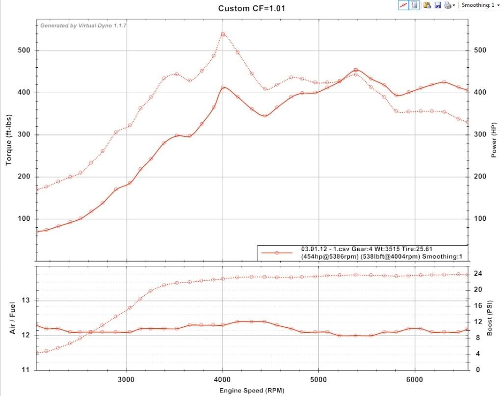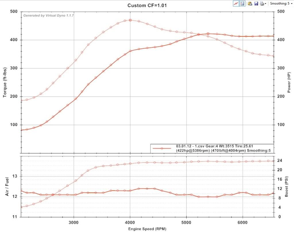 That is a little higher than I would expect at that RPM normally. I wouldn't expect every pull to be that high as their was a bit of a spike their on this pull, which was likely related to a hump in the road. Here is the same pull with smoothing set to 1 to show the spike at 4k: http://i77.photobucket.com/albums/j6...0112-1vds1.jpg I am currently targeting something like 400-430 ft-lbs over as broad a range as possible. Specifically, I am trying to carry the torque higher into the RPM range, which is causing me to bump into LCV2™. In this pull, I am over 400 ft-lbs from 3300-5600 RPMs, and other than the spike around 4k it looked pretty good. |