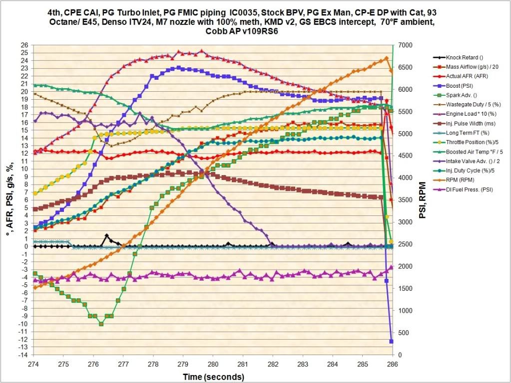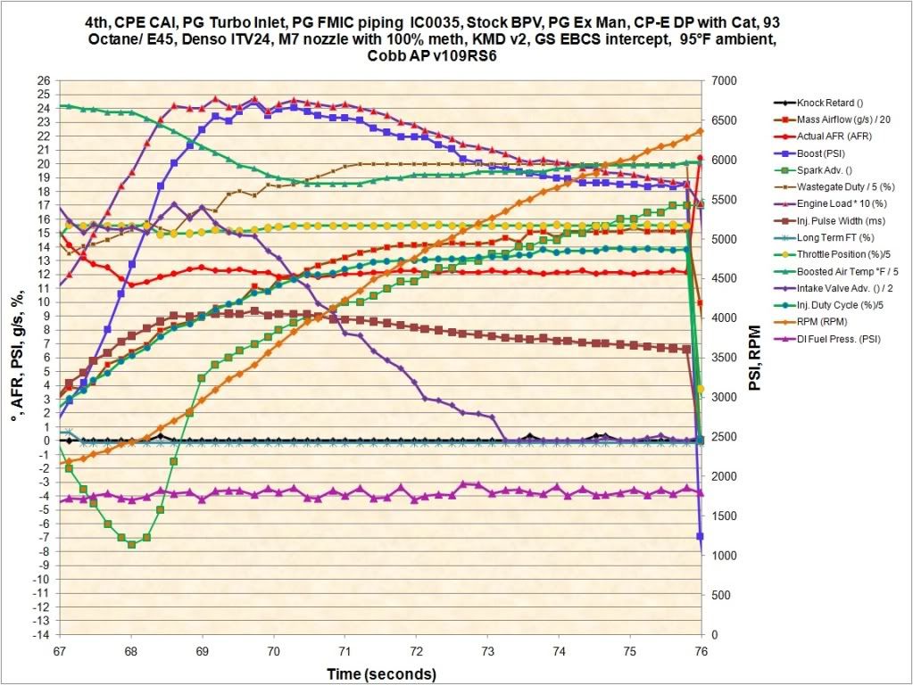 1 Attachment(s) Attached is a compare of [50/50 meth D05 nozzle + 93] vs. [6 gal of E85 with no meth]. All I did was calibrate the MAF and adjust the load tables. I left AFR at 11.9 and timing tables the same on both runs. There is a noticeable driveability difference between the two setups unless its just the placebo effect. Seemed like the car was just so much more enjoyable. Part throttle was smooth and felt like it pulled more and kept me planted in the seat. Temps were identical and the runs were done on the same stretch of road. I'm going to turn on the meth next to get the BATs down to see if that does anything at all. After that I'll see what some timing will do and maybe lean out the car a little more. |