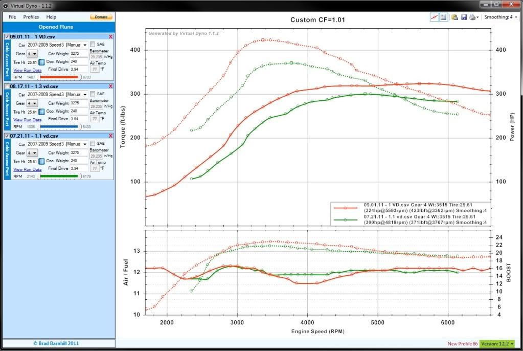 1 Attachment(s) @silvapain: Here's a 4th gear run in virtual dyno: Using the standard dynojet correction factor of 1.07 was definitely high. I had to cut it down to a correction factor of 1.01 in order to get it closer to my dyno numbers. I also removed the very low end portion of the dyno graph, since dynos don't really read low rpm's. Virtual dyno with 1.01CF and 3700+ rpm: http://i64.photobucket.com/albums/h1...Gear_101CF.jpg ^^As you can see, the above run was lean, so it's possible it was my leaner map. BUT, they were almost identical power curves. For reference, again (cropped version of prior dyno graph): http://i64.photobucket.com/albums/h1...20110828-2.jpg Overall, the curve looks damned similar - very impressive. Maybe the dyno I was on was just a stingy whore, haha. @bbarnhill - Thought you might like to see this! Any comment as to why the standard correction would be so much higher compared to the actual dyno run? Conditions were almost identical to when I dyno'd. Datalog is attached to this post. |