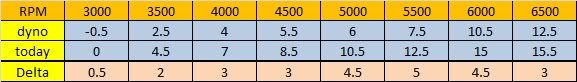 Just compared my log from today vs my March 2010 dyno (in sig)... Here are the differences in timing: http://i77.photobucket.com/albums/j6...Dynotiming.jpg More than I thought...I really need to get back on the dyno... My table calls for 16.5° at 6500 RPMs today, but I got 1° of KR. |