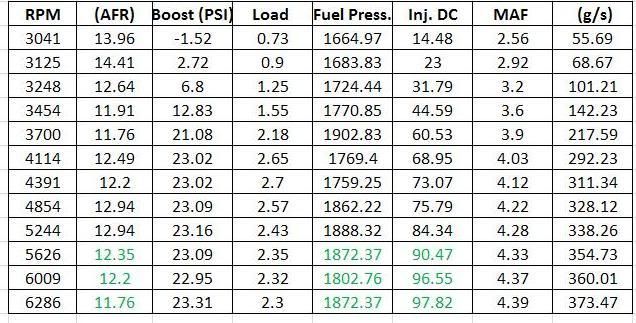 As for other modifications - none, really. I made the tune "safe" by lowering boost as much as I could and adjusted the MAF curve, but that's a given when doing something like this. I had to get the extra fuel line in order to incorporate the filter as easily as I did, but that's about it. Boost was around 15psi @ 6k rpm when I saw the high duty cycle. Quote: