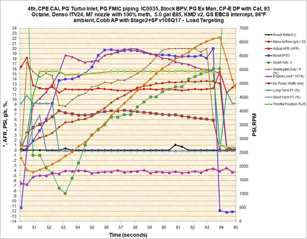 So, quick question. I ran 3 gallons of e85 over the course of the day yesterday and I saw some higher RPM knock. My AFRs were in the 12.5 range (without MAF recal). Boost temps were lower and G/S were around 230. Changing back to 91 removed the knock in the higher RPM band (now zero). Could it be my injector seals as opposed to running lean? I was only seeing .8 to 1.3 KR. |