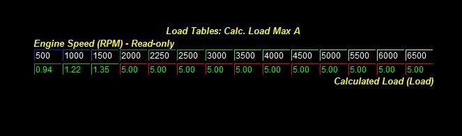 Your requested load A-C need to be upped to 5.00 as well. My calculated load hits ~3.6 at WOT. My max load tables are the same as my TRL tables. |