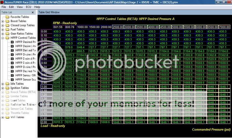 | Not Ranked : 0 score You sure? I've got 1850 requested for all my HPFP desired pressure tables above 1.20 load and 2500 rpm - here's a screenshot: ![]() FWIW my observed fuel pressure is above 1800 most of the time now too. |