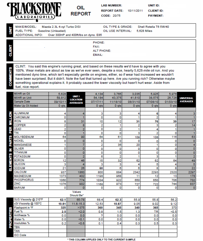 (Thread Starter) | Not Ranked : 0 score Another EXCELLENT oil report while running E85: ![]() I'm guessing the fuel content is from running 93 while I went to the dragon. It was running rich as hell while I was down there, so I'm not surprised to see it. I changed the oil shortly after I got back (I may not even have switched back to E85 at that point, actually). So, 3500-4000 miles on E85 and 1500-2000 miles on 93 in this report. Apparently, massive torque on the low end doesn't hurt a thing