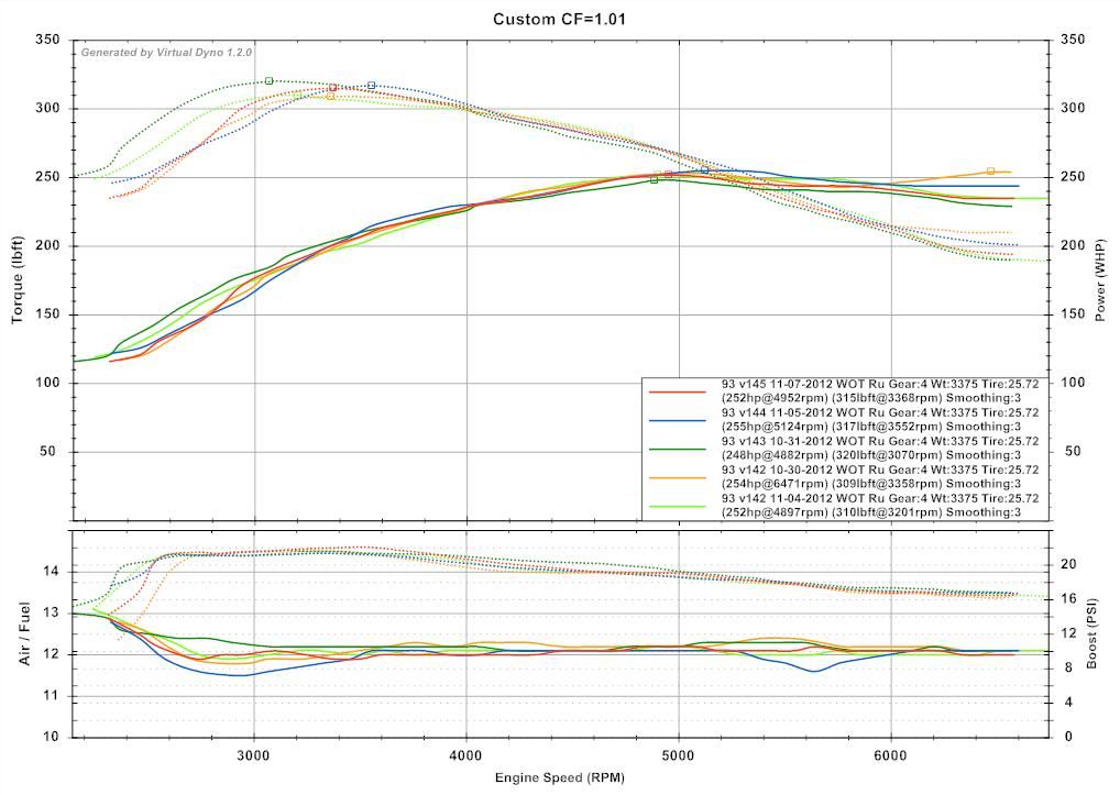 (Thread Starter) | Not Ranked : 0 score I've been playing with tuning on 93 when I have the time. I also indexed the plugs the other day. I'm not getting blowout on 93, but I have a lot of testing to do to figure out timing on this setup. I have attached four WOT logs; the first two (v142 map) use the WOT timing values from my pre-ZZB pump gas map. For the second two (v143 map), I pulled 1.5° timing from ALL my ignition maps (CL and OL). With the lower timing the car felt better at and shortly after spoolup, but felt very dead at high RPM.